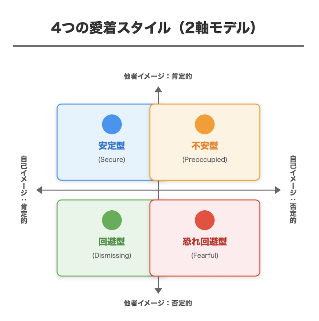 • 成人愛着の4分類モデル(安定型、不安型、回避型、恐れ回避型)の原典。自己イメージと他者イメージの2軸による分類。